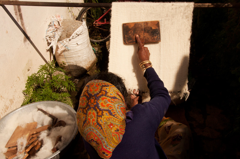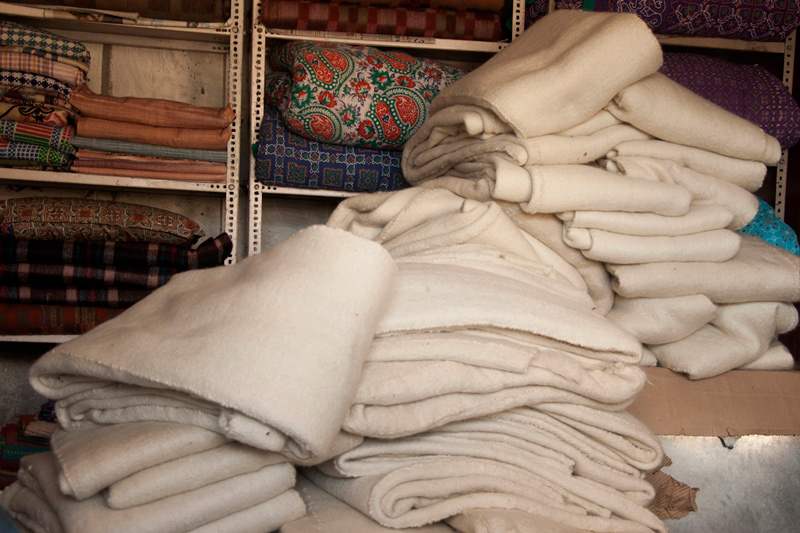 After the brushing process is done four strips of blanket is stitched together and converted into a big Thulma blanket. This blanket is not dyed in color, they are basically weaved in white woolen thread. Dying is done by the NGO according to the customer’s demand after weaving.
