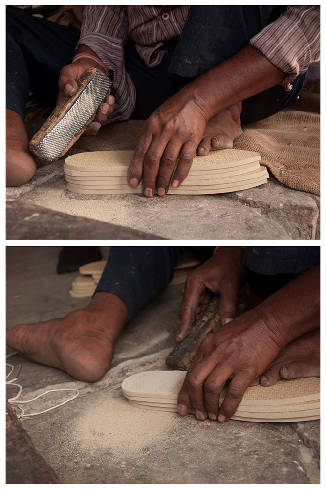 When it comes to the shoes that are made of rubber, initially the textile that covers the upper part is decorated with embroidery using beads and precious stones. These upper embroidered textile and rubber sole are brought separately to Mochis. In his shop Mochi cuts off the extras of the sole and gives proper shape to it. The back rough side of the outsole near the end of the foot is leveled and made flat by rubbing it with a tool. On the flat area heel is attached using glue. The upper embroidered piece of textile or the material’s border (topline of the shoe) is given decent finishing by sticking the matching colored paper strips by applying glue and are pressed thoroughly or beaten them well to make the strip gets stuck to the border (topline) as a strong bond. Once they are dried the upper decorative portion is turned in and the edges of the construction of the sole is stitched to the rubber insole with the same cotton thread. Then the protruding cotton threads are hammered flat for the neat finishing.