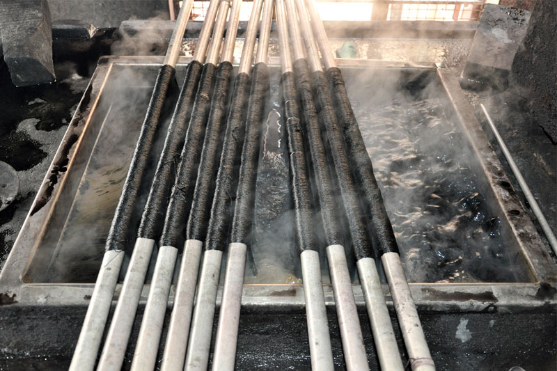 Adding leases: Once the piecing is done, the weaver unrolls the warp out on street on stilts to insert lease rods and to mark out the length of each saree. The leases are inserted and marking is done using a bamboo stick and damp kumkum. The warp is then rolled on the metal cylinder that acts as the warp beam. The setup is then taken indoors to be fitted onto the loom.