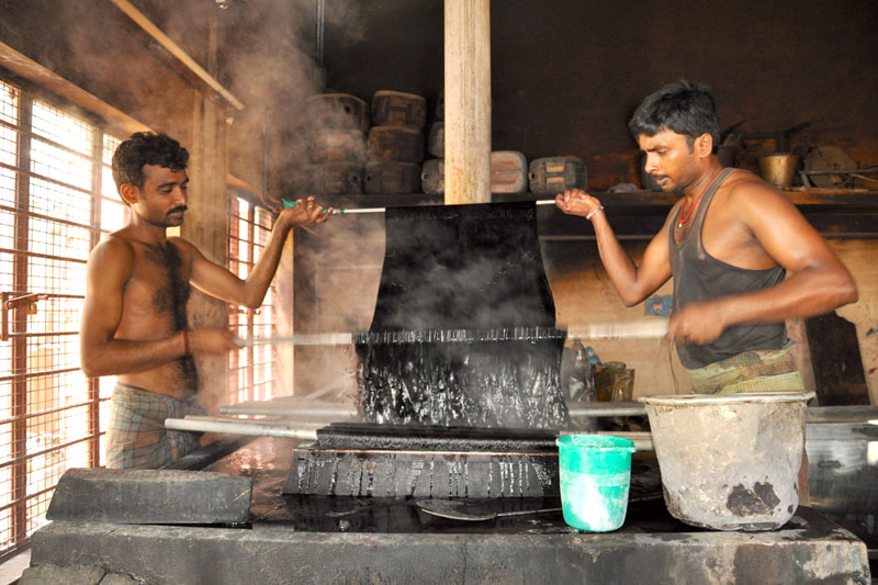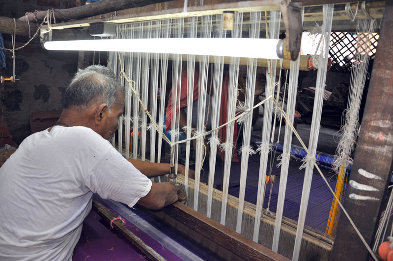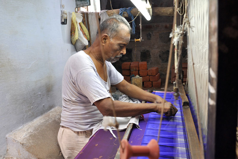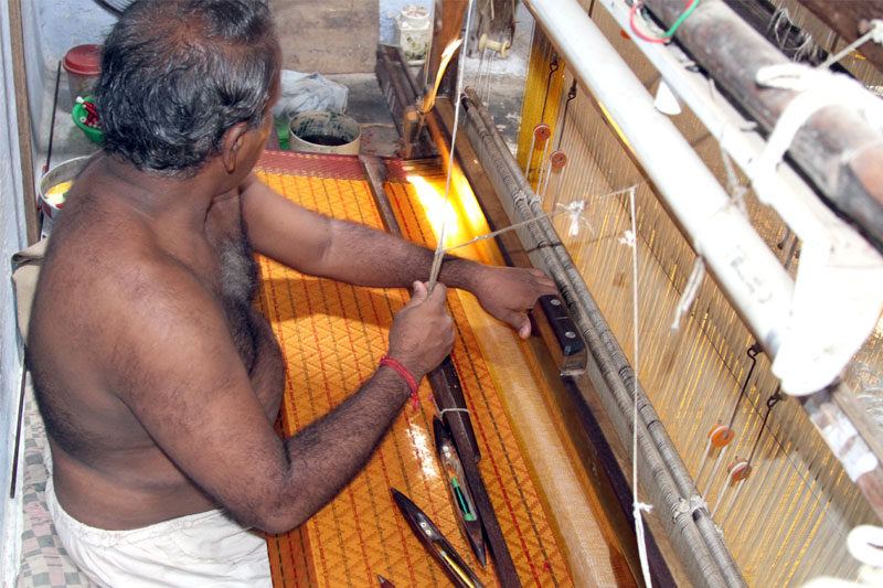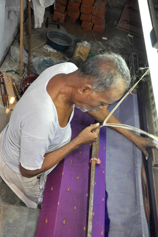 Making saree: The body of the saree is woven in a plain weave and the cross border is woven in a rib weave. The saree is soaked in water overnight and woven wet. This prevents the saree from coiling on itself or tangling. After every few inches of weaving, a solution of gum Arabic is applied to the saree to stiffen it.