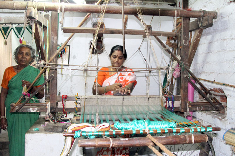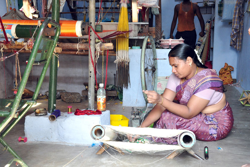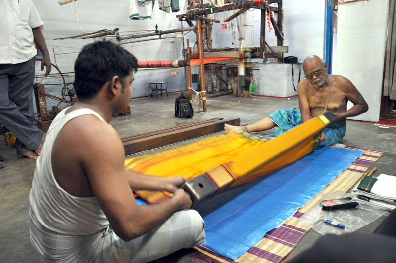 The loom: The loom used for silk saree weaving is a raised-pit loom. A cement seat is constructed for sitting and the local wood craftsman makes all the parts of the loom and assembles it. Teak wood is used to make looms. The warp beam is fixed in its position on the loom and the warp stretched out. The border pattern warp ends are hung using vertical nylon threads and connected to the patterning box on top.
