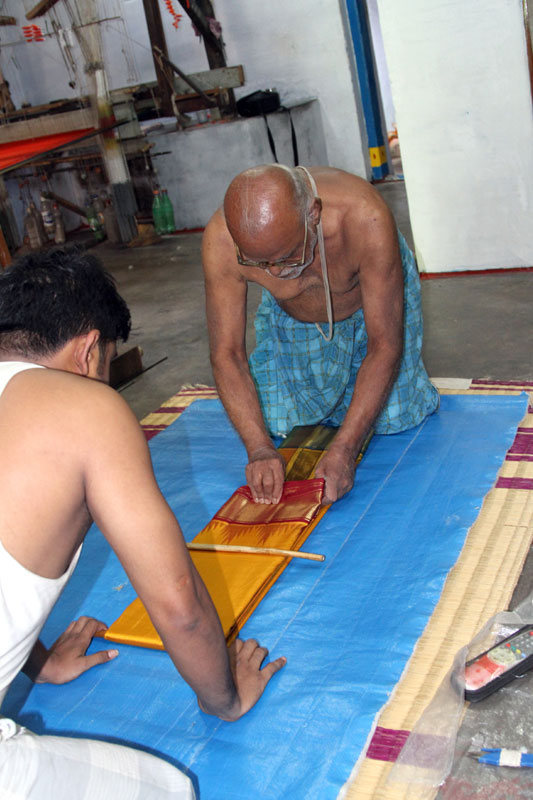 Folding: Once the sari is made beam is removed and the kept in sunlight for a while to stiffen the starch and gum. Once dried, the saree is folded in a set pattern. It takes two people to do this task. It is usually the husband and wife who do this and tie it. The sarees are then stacked and covered with fabric, ready to be taken to the cooperative or private dealer.