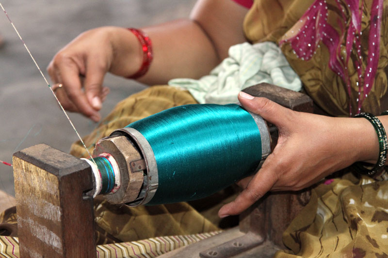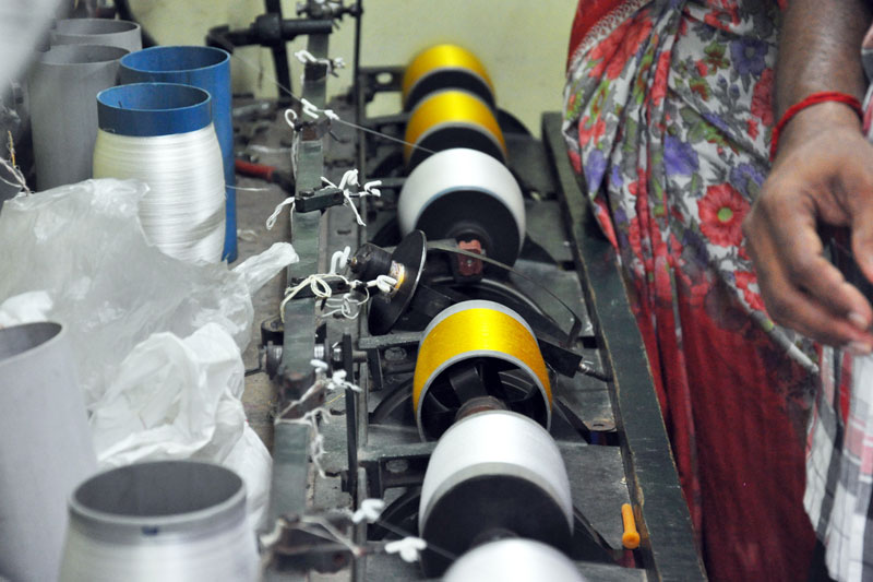 Winding weft: Weft yarn is wound on a metal cylinder from the hank and allowed to soak for two hours. Soaking the weft yarn ensures dense packing of weft and a smooth finish. The weft yarn is wound as the weaving progresses. This is done mostly at home by family members in their free time.