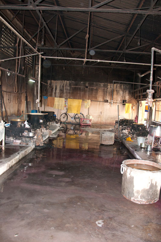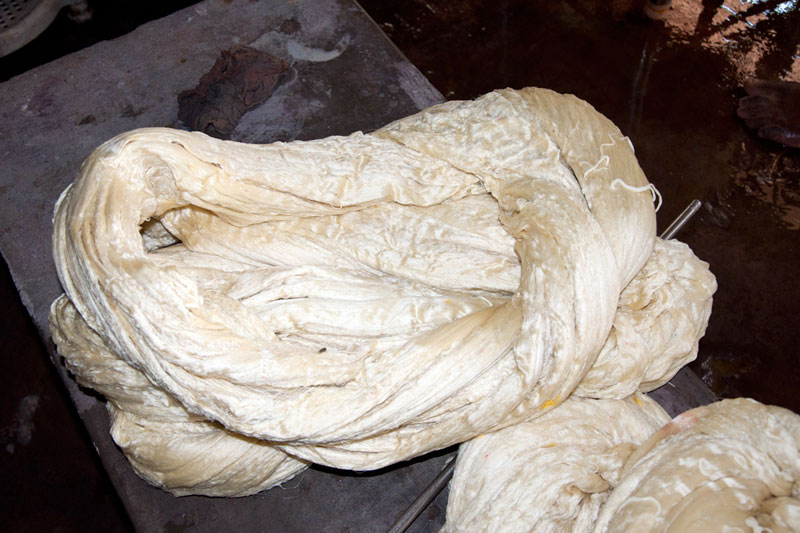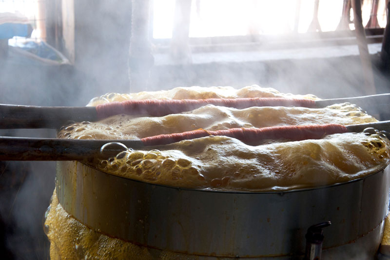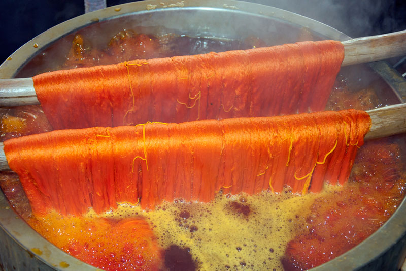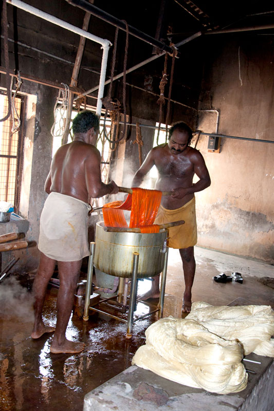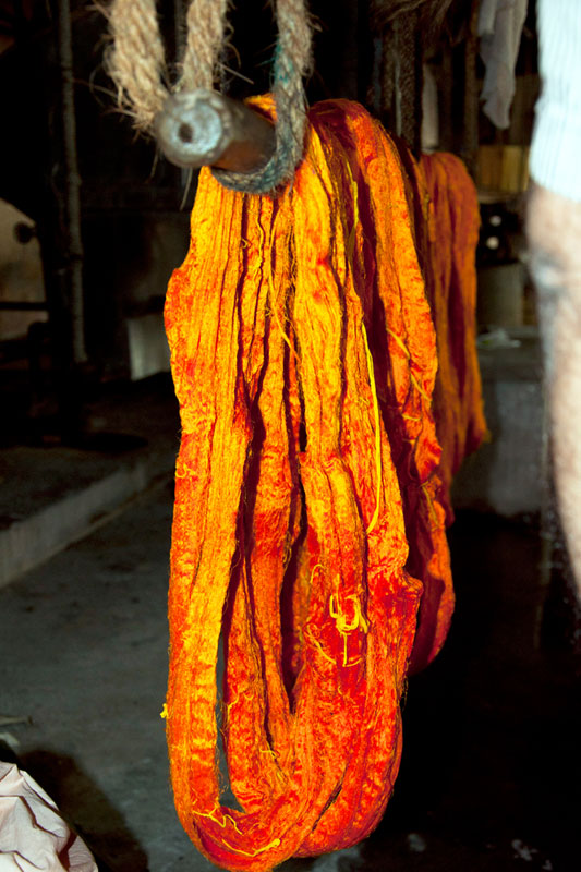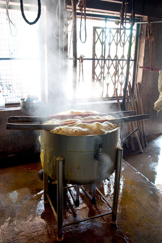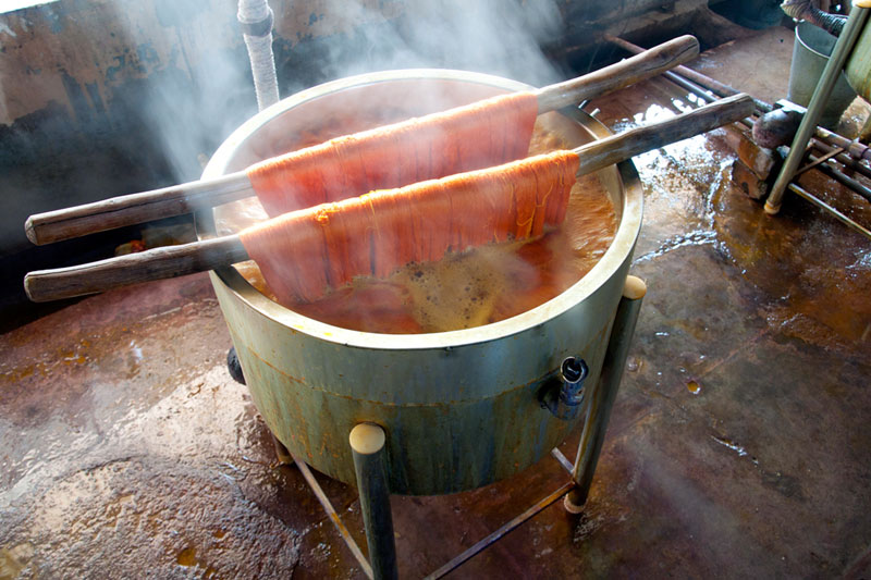 The off-white silk yarn is bought from market and then taken to the dyeing process. The dye color is added to the huge container with boiling water. In Thirubuvanam, the boiling process is done using automated boilers. During the dyeing process the silk yarn is immersed in the colored solution. The yarn after dyeing is to taken out from the container and it is allowed to dry for 2 to 3 days. The dried silk yarn is further sent to spinning process and warping process.