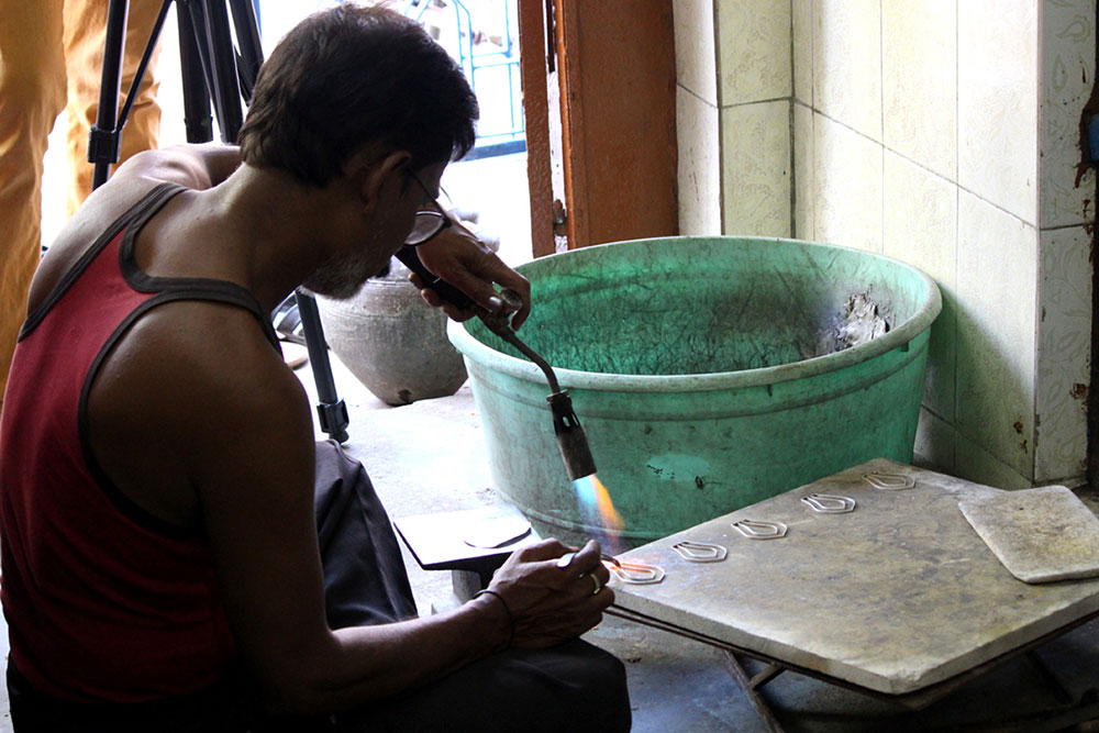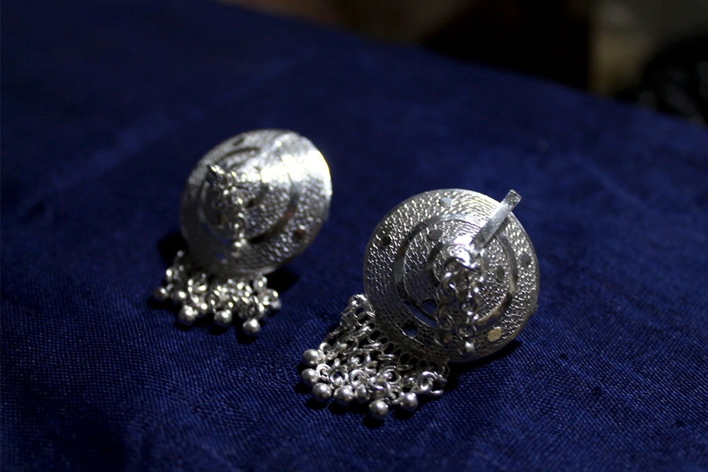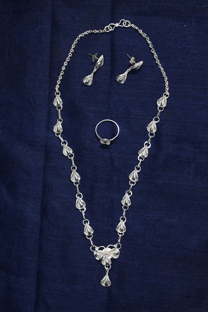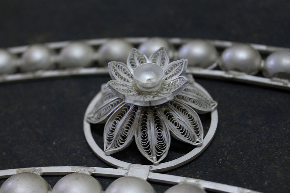 Silver filigree is a style, which may be of two types, ornamental and decorative. Fine pliable threads of metal are curled, twisted and plaited, then united at their points of contact with each other, by means of gold or silver soldering with the help of a blowpipe to make the desired object. Techniques such as nipping, plaiting, jointing, piling, filling, and knitting are used in making filigree jewellery.