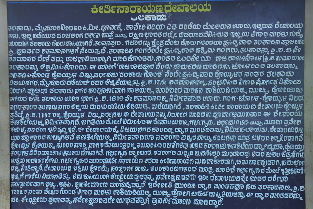 Sri Keerthi Narayana temple is dedicated to the Lord Vishnu being considered as one of the five Vishnu temples, famously known as Pancha Narayana temples. It is established at the behest of Shri Ramanujacharya during 10th century and was constructed later in Hoysala style during the reign of the Hoysala ruler Vishnuvardhana. It is believed that the Hoysala ruler constructed this temple to represent their victory over Cholas during 12th century and it is the only Hoysala architecture found in Talakadu today.