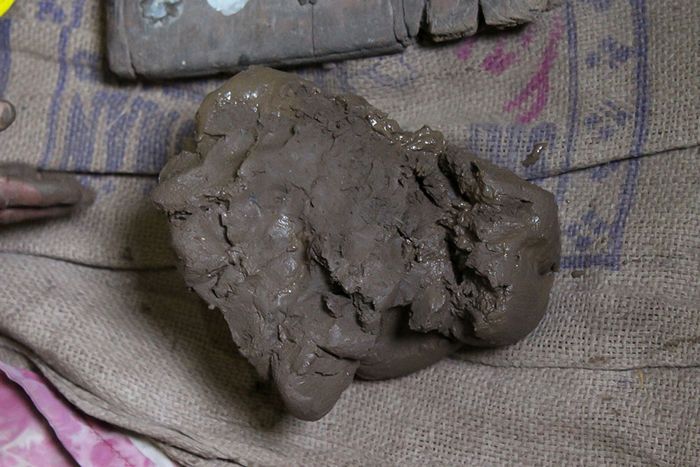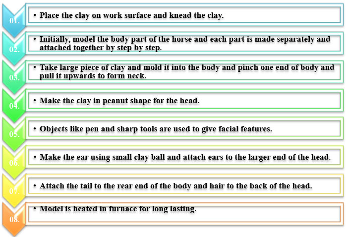 Here we are elucidating on the making of a terracotta horse. Generally, each part of this horse is made separately and assembled at the end. Hence to start with, the selected type of clay is placed on the workspace and kneaded well gently. Then it is spread evenly and cut into half in a rectangular shape. One portion of it is molded to form the horse's body edge. Another piece makes its neck. This portion is pinched at one end and pulled upwards to form the body part. Next, the artisan proceeds to the head forming, where three equal-sized clay pieces are turned into a peanut shape. It is then stretched appropriately to create the horse's nose and mouth. Moving to the facial features, the artisan crafts two triangle-shaped ears out of equal-sized clay portions. Using a pen, the eye of the horse is made by pressing. Clay rolled into long cylinder shapes makes the legs and is attached to the main body design.
