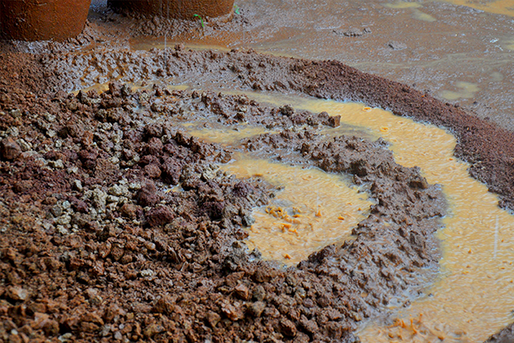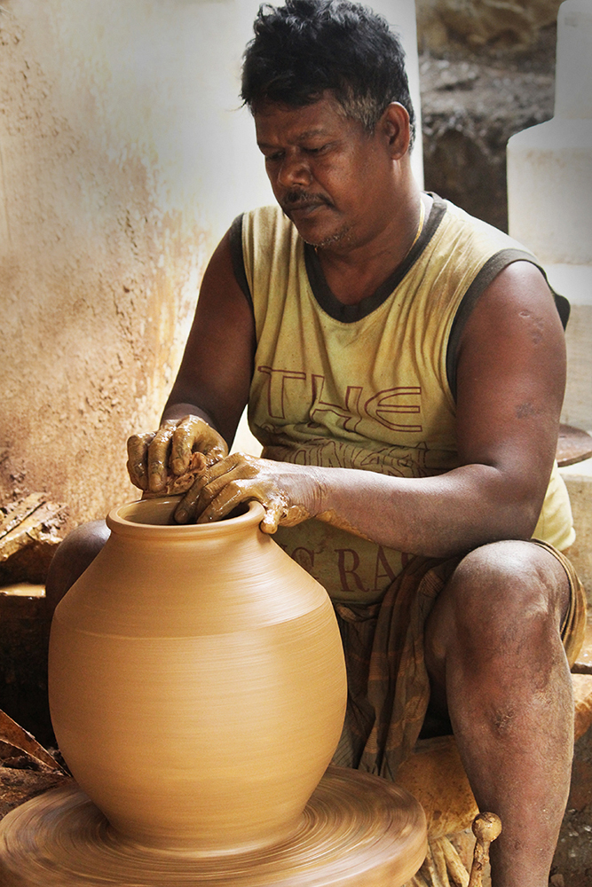 The clay used for ghatam making is been collected from five-six ponds. Every clay sample has its own apparent moisture content, porosity, absorption capacity, density and specific mechanical strength. Thus the quality of clay is the most important factor that has to be taken care of. The clay is allowed to dry for two days. The components of the mud are separated by sieving and dissolving in water followed by filtration. Then the mud is mixed with the sand collected from Vaigai River. An appropriate amount of lead and graphite are added to it, to improve the tone. This mixture is rich in calcium lime, ash, red lead, sodium silicate, manganese, iron and plasticine which enhances the metallic sound of the instrument.This mixture is further stamped completely for six hours (Kneaded with the leg) and kept aside for two days. After two days, when the clay gets stronger it is used for casting the pot.