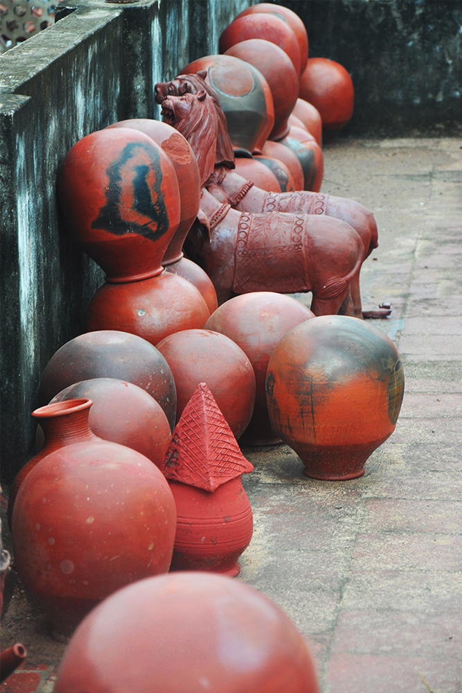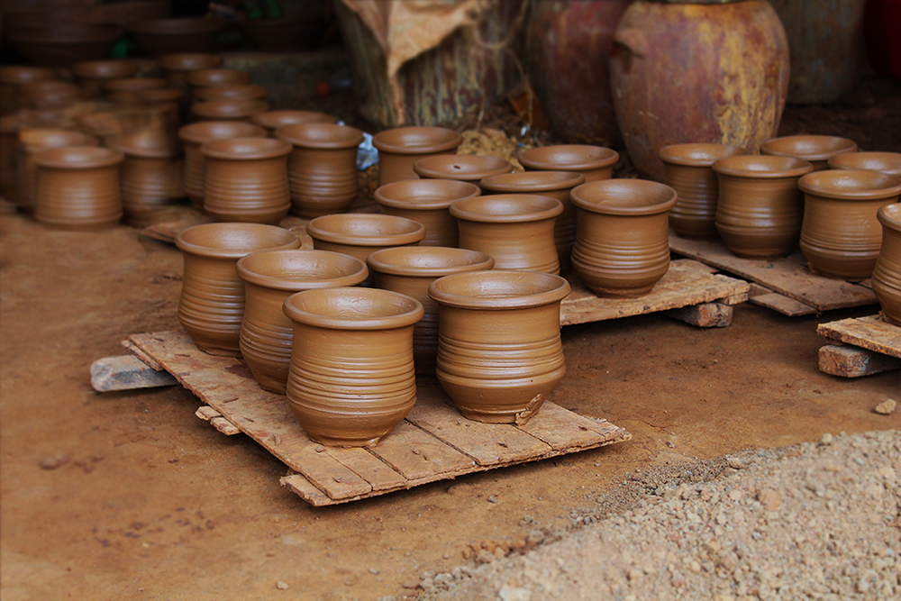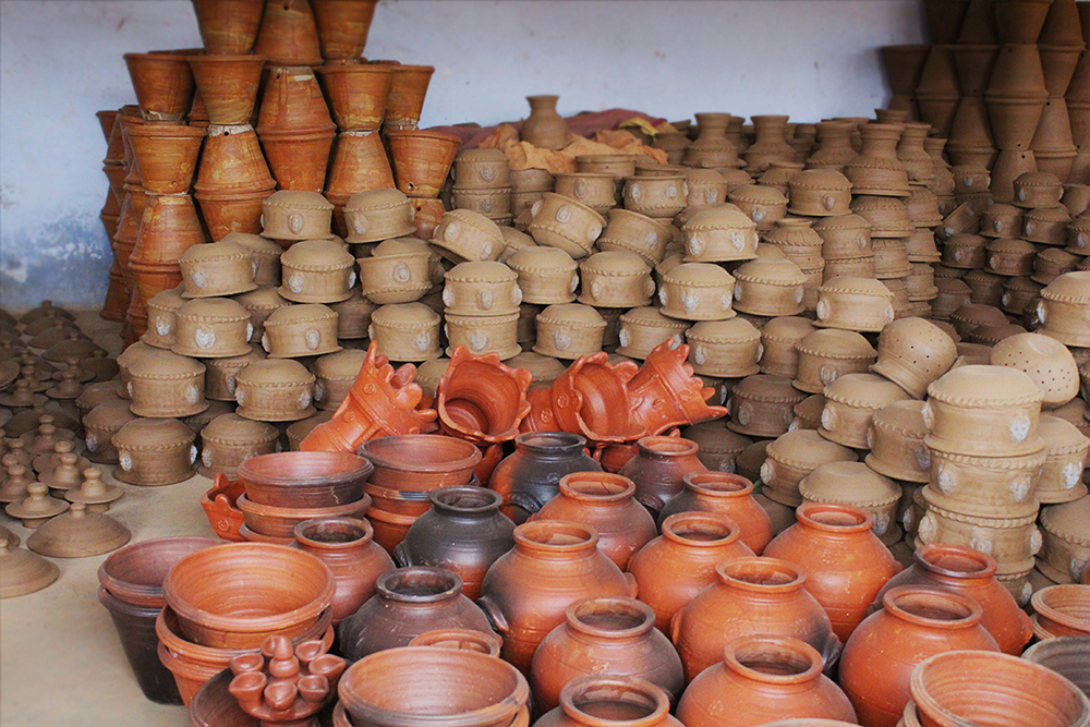 Over the years making of ghatam has seen many changes. The instruments that are made these days tend to be players preference. They are manufactured lighter, smaller and more elegant. Thus they are very easy to carry around. But the ghatams made at Manamadurai are still the heaviest variety. They weigh thrice as much as a cooking pot and at least double thickness. In a year nearly four hundred ghatams are made but only 40% of the pots that are baked turn out with the desired tone and shruti. These ghatams are sold for INR.600 per piece.