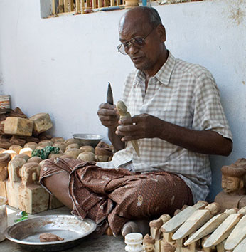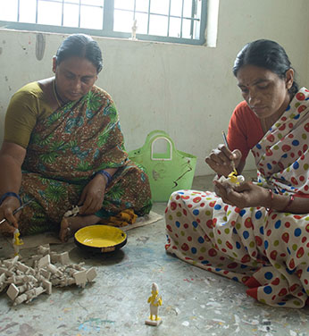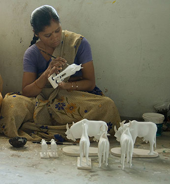 Makku is made by boiling a mixture of finely ground powder of tamarind seeds and sawdust in water until it becomes a smooth paste. It is applied using a tool called palapu chekka. This tool is a thin and smooth piece that fits comfortably in one's hands, made by filling a cow’s horn into a smooth oval-shaped device. The use of this tool is also a unique feature in the production process. Brown paper or newspaper or cloth is stuck on the cracked areas using maida solution reinforcing the strength of the toy. After it dries, it is smoothened with sandpaper.