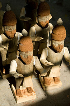 Proper seasoning of wood is very important. Wood not seasoned properly or for long enough becomes worm-infested and unusable for toy making. As such no external pest control measure is adopted. The pieces are kept on a wireframe over a bowl with burning sawdust to make it warm and easy to carve.