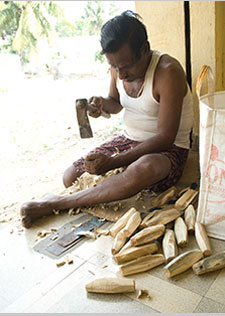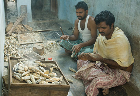 Healthy and mature trees of ‘Tella Poniki’ that have reached a height of a minimum of 10–15 feet and 2-3 feet bark diameter are selected from the nearby forests of Kondapalli. The selected tree is cut/ chopped into the wood of manageable pieces. The freshly wood is usually heavy in weight. It is therefore allowed to dry in the sun for about 20days to a month. This is called seasoning. During this time the cut wood loses sufficient moisture and becomes light and soft, to the extent that one can cut through the wood with ease. This makes it suitable to carve interesting figures (i.e for artistic wood carving).