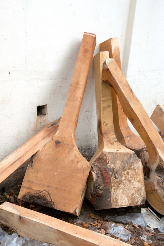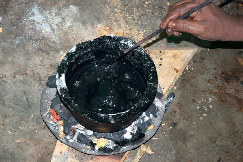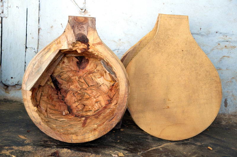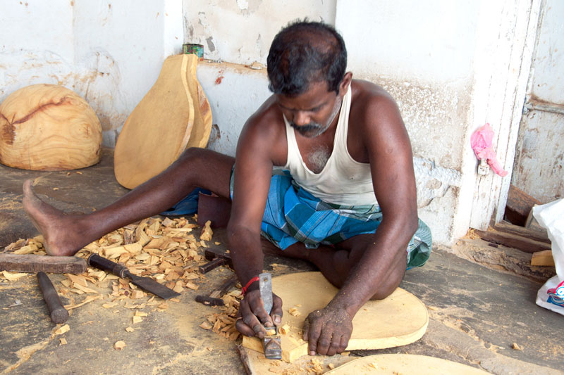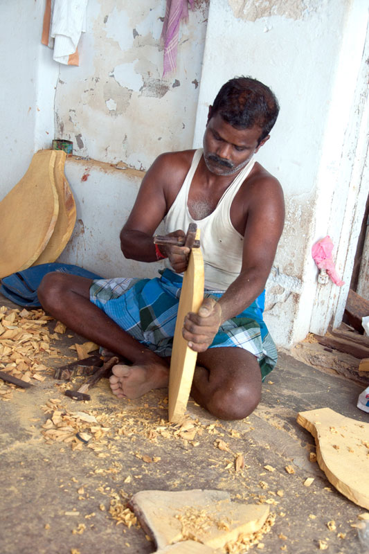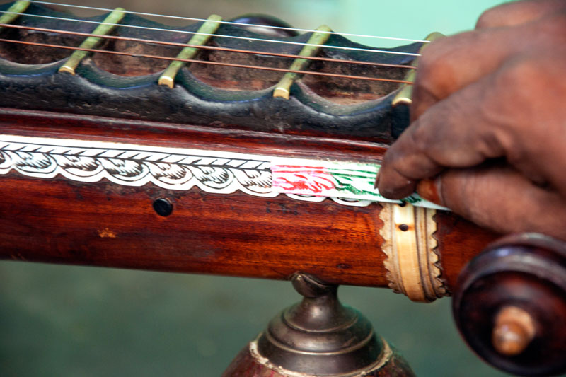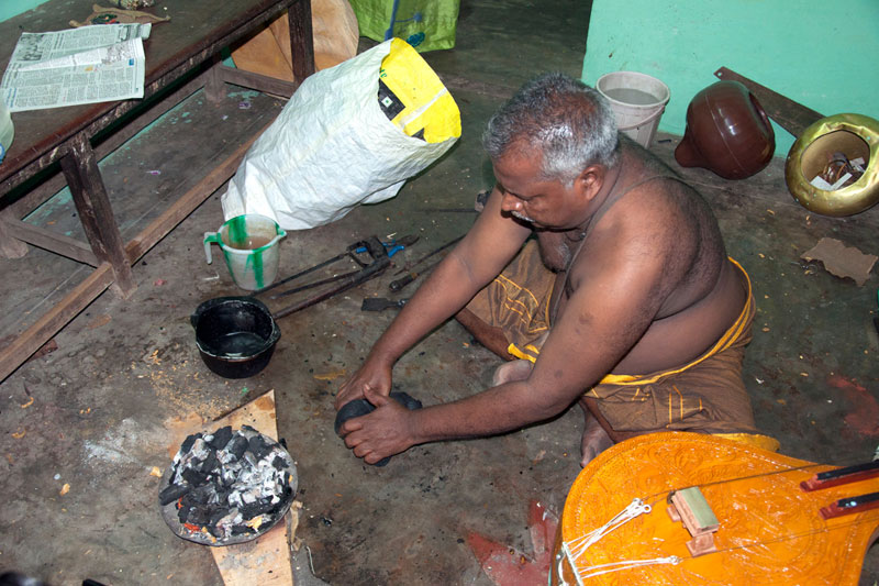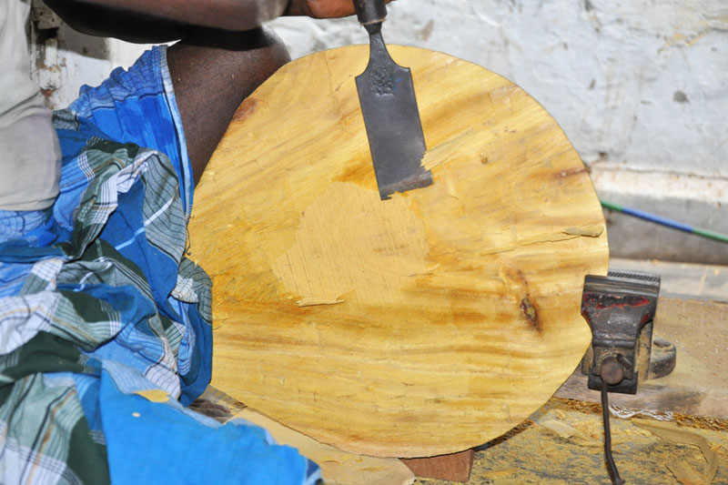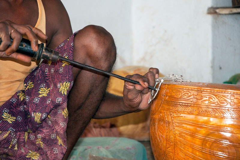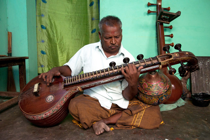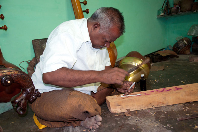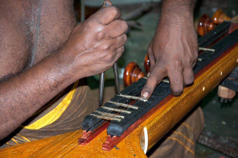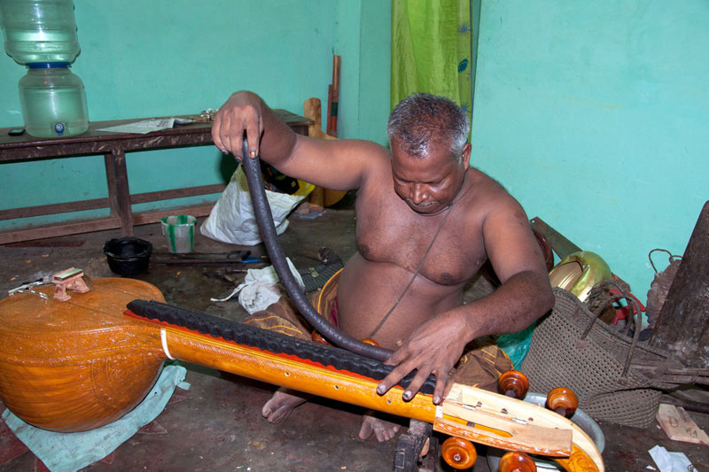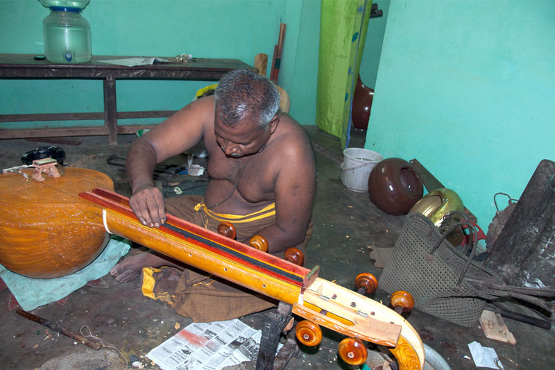 The making process of musical instruments is a laborious process. It takes minimum of twenty days to complete the product. The traditional Thanjavur Veena has three parts such as fingerboard, resonator and peg box. Pala maram (called locally)-Jackfruit wood is used to make veena. The entire instrument is carved on a single block of wood. A pot-like shape of the Veena is made out using round chisel called Kolavu uli. The resonator of Veena is made by scooping the wood and then a circular wood piece is made to cover the resonator. The seven metal strings are tied at the end of the bowl to metallic fastenings using metal rings. This helps the musician for accurate tuning. The metal frets of 24 are fixed on the finger board of veena using the mixture of beeswax and charcoal powder. These metal frets are made out of brass. The pegs and knobs for the strings are made of rose wood. These are fitted to the instrument using beeswax. Finally the embellishments of veena are made using lac colors. The performance of finished veena is tested by the musicians of Thanjavur before being sold in the market.