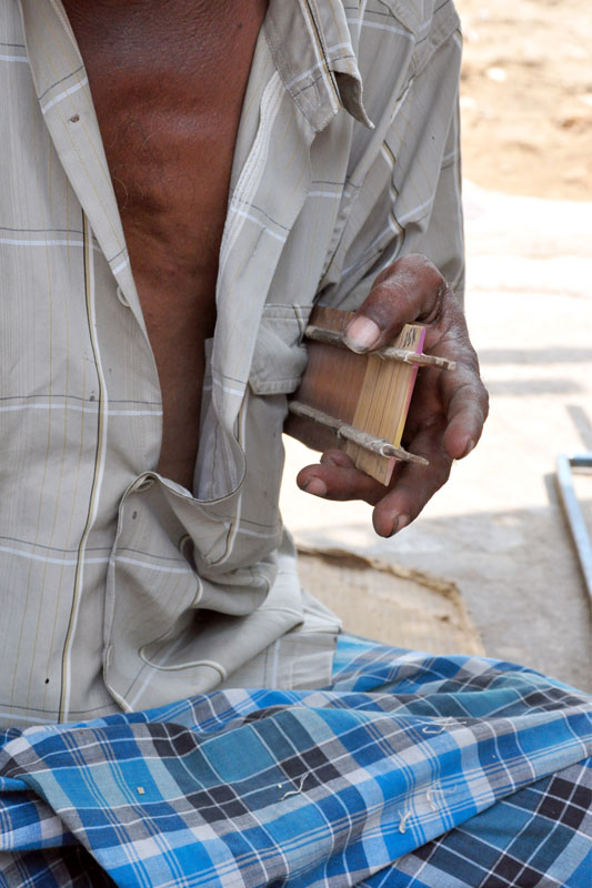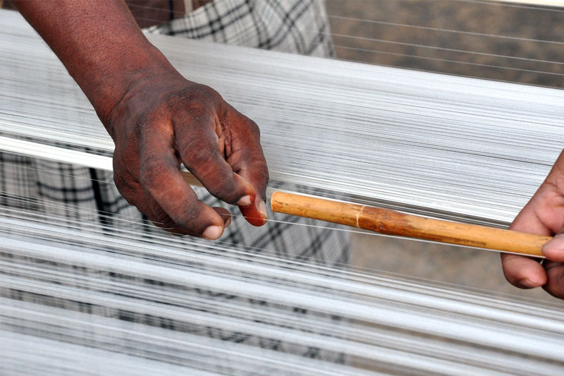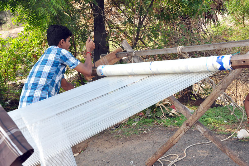 The cooperative society provides yarn to the weavers. The yarn is given out for warping and starching to the machine-wrappers for a sum of rupees 500. The length of the warp is 40 gajam (yards). Piecing (acchupunaikardhu): Piecing is a process where the existing ends on the reed-heald setup is joined with the ends from the new warp by twisting. This pre-weaving process is undertaken by older women. For cotton, the piecing wages are between 80 to 100 rupees per warp for a veshti.