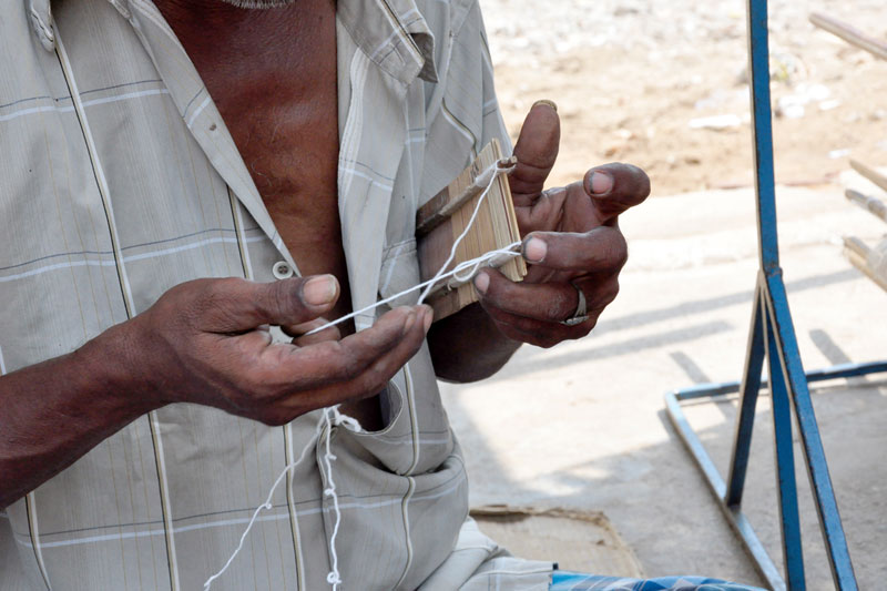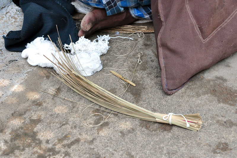 • They are then knotted on two horizontal thin bamboo rods using nylon yarn.