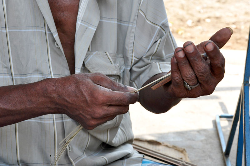 The Labbai or Bai communities in Ammapet are small and cater to the reed and heald making for all the handlooms in the area. They speak Urdu and Tamil. Both men and women work on reed-heald making. About four to five families work on bamboo reed making, heald making, drafting of the healds and denting of the reed. The reed-heald setup is a vital part of the loom that controls the way the threads are lifted. Over the last ten years, number of orders has dwindled and people have changed their occupations. The younger generations are not involved in the craft. Some bamboo reed makers are now involved in sourcing and servicing reeds. To make one set, they are paid 600 rupees for angavastram and 1000 – 1500 rupees for a veshti. Making the Thattupannai (bamboo reed), Irumbupannai (iron reed).