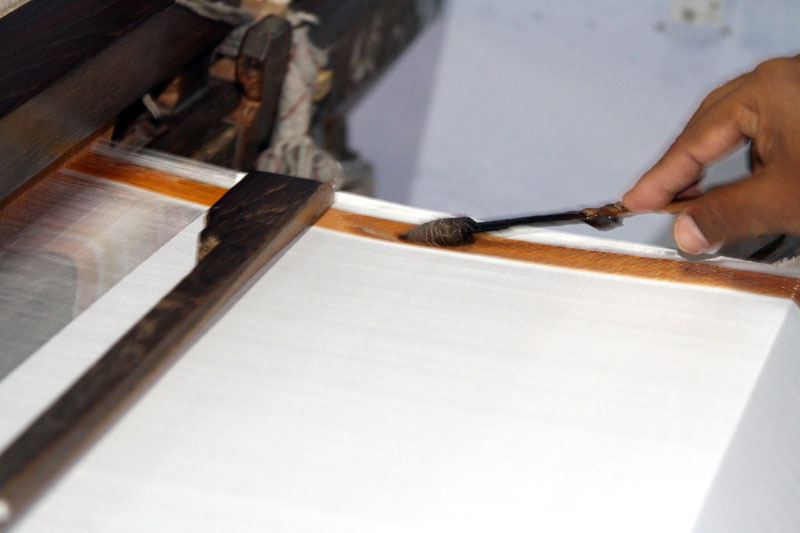The body of the veshti is woven in a plain weave and the cross border (kambi) is woven in a rib weave. A sedukattai is used to keep the width constant and is adjusted after every few inches of weaving. In the case of cotton, the yarn is woven wet whereas in silk, the warp, on loom is starched every few meters with kanji (rice starch) and kerosene. In both cases, the zari is soaked in water overnight and woven wet. This prevents the zari from coiling on itself or tangling. After every few inches of weaving, a solution of kondhupassai ( gum Arabic) is applied to the zari to stiffen it and the white borders are smeared with cooked rice and rubbed down to make it stiff. The folded front of the veshti is rubbed down with a metal plate to blur the weft. This makes the veshti smoother in finish and gives it shine.