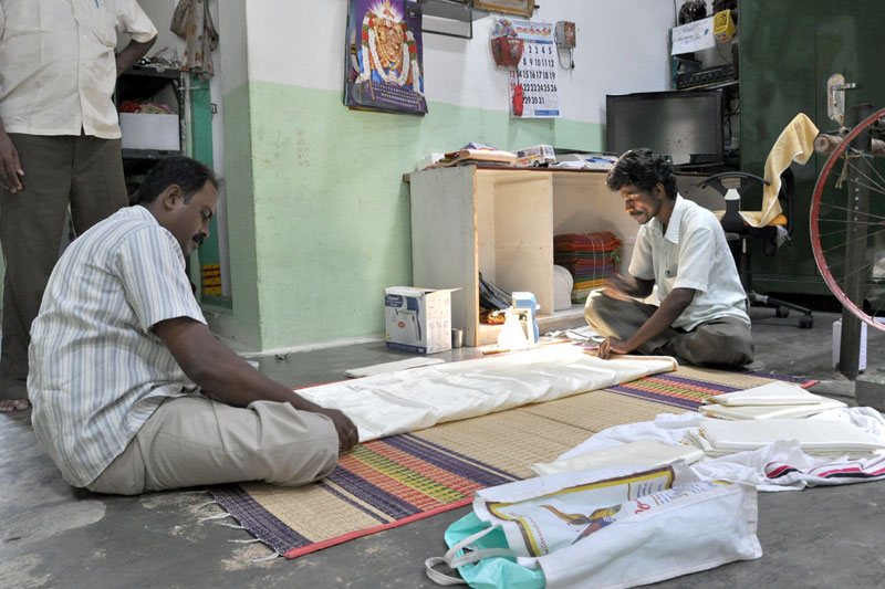 The process of making veshti is divided into following stages and the division of work is done as below: