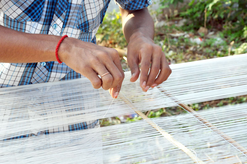 After the reed is made, cotton yarn is twisted to make leases and dented in the slots of the reed. Once the denting is done, 8 kols (bamboo rods) are positioned for the 4 shafts and healds are tied by threading through the warp ends. Plucking each warp end and looping the heald eye around it from both the face and back makes the eyes of the healds. Once the healds are made, the setup is ready to be collected by the weaver. The weaver sends the setup and the warp roll to be pieced together.