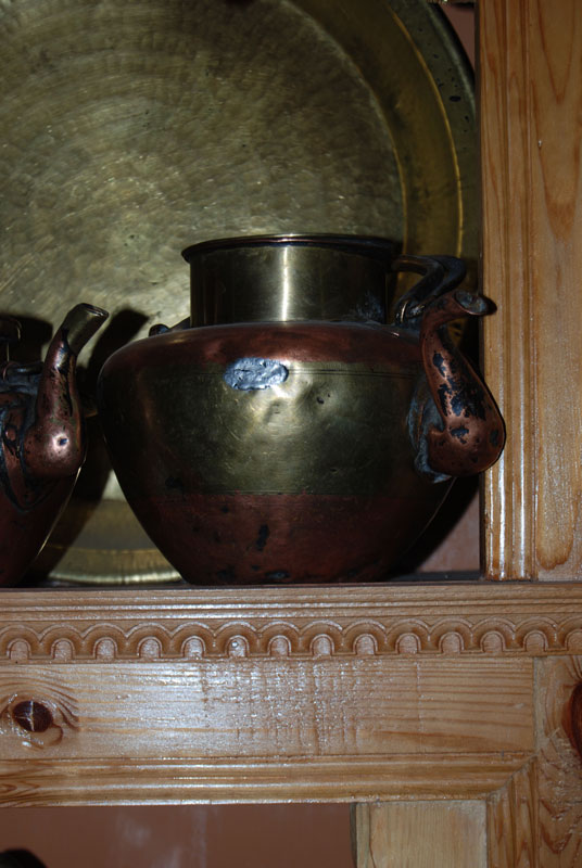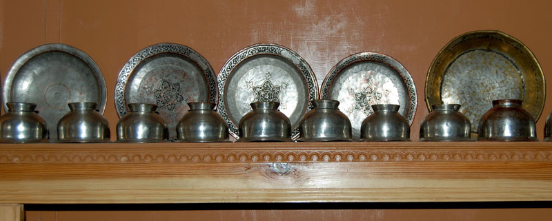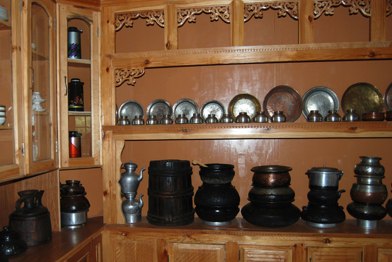 The kitchen is the most important part of the house, very well decorated and maintained by the women. The interiors are made of wood and metal with intricate carvings on the pillars, shelves, beams and low curved tables.