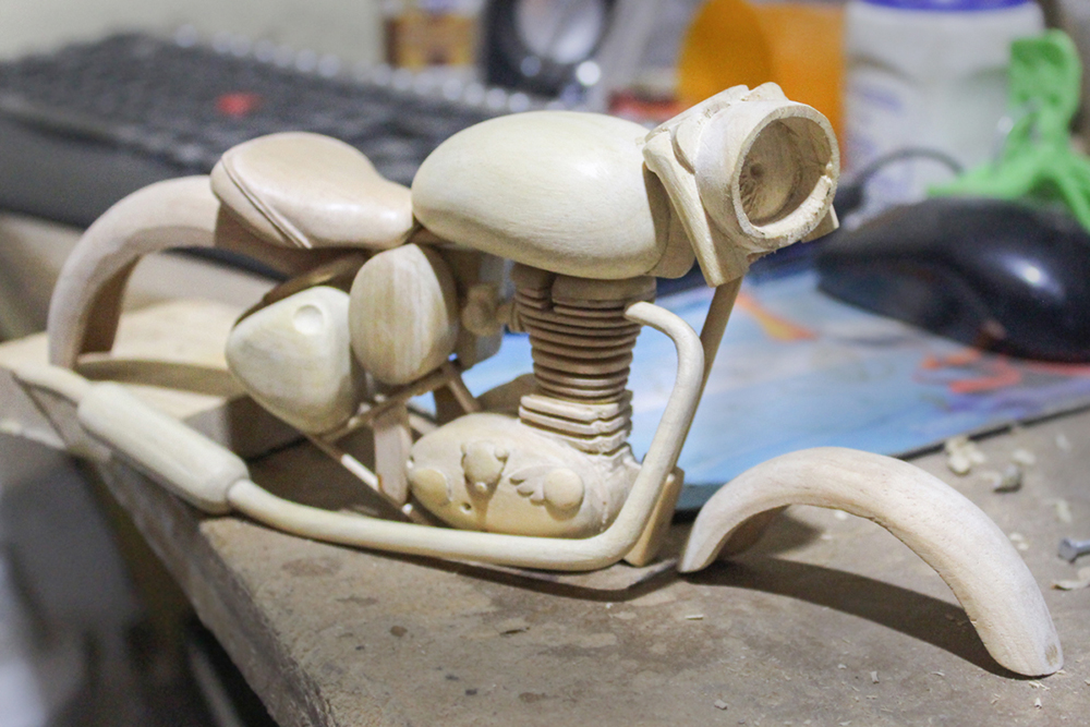 Several parts are made which will be assembled after completion. Handlebars, headlight, triple tree top, triple tree bottom, exhaust pipes, forks, front wheel spacers, wheels, foot pegs, tank, bike frame, seat, rear wheel axle, rear fender, battery cover, engine cylinder and cover are few of the parts made. These motorcycle parts are later fixed together either with adhesive or with nails.