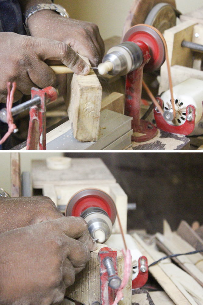 To build the wooden motorcycle toy, artisan makes miniature part of the bike and later assembles them into place. Machines like Electric Jigsaw, Electric Dremel Grinder, Bandsaw machine, Electric Sanders are used for cutting, giving wood a shape and buffing it. The wooden parts are further smoothened with sandpaper if necessary.