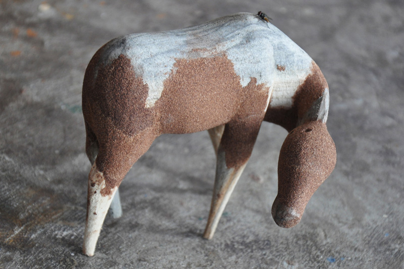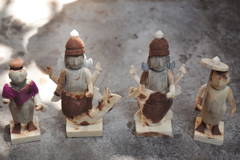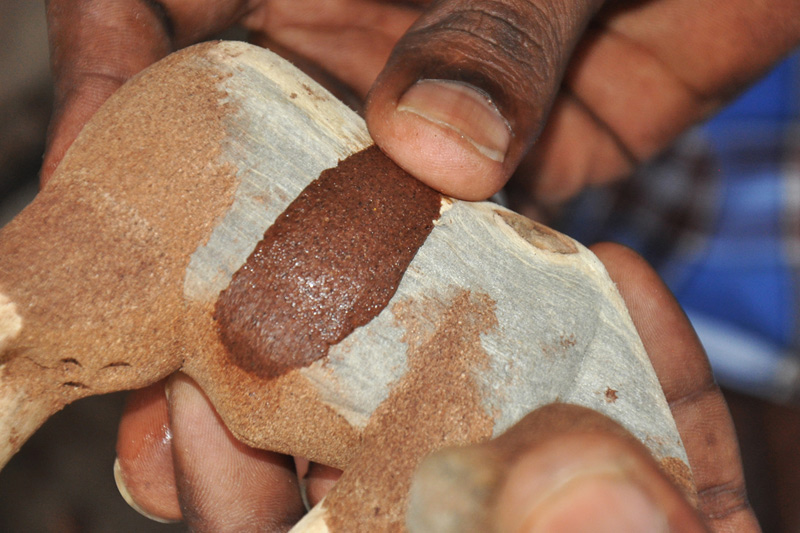 Once the carving is done, the early-prepared Aakra paste is applied to the toy to fill the cracks and also to give proper shape of the toy. The toy is dried and then smoothened by rubbing with sand paper. Once the surface is smoothened, it is sent for coloring process.