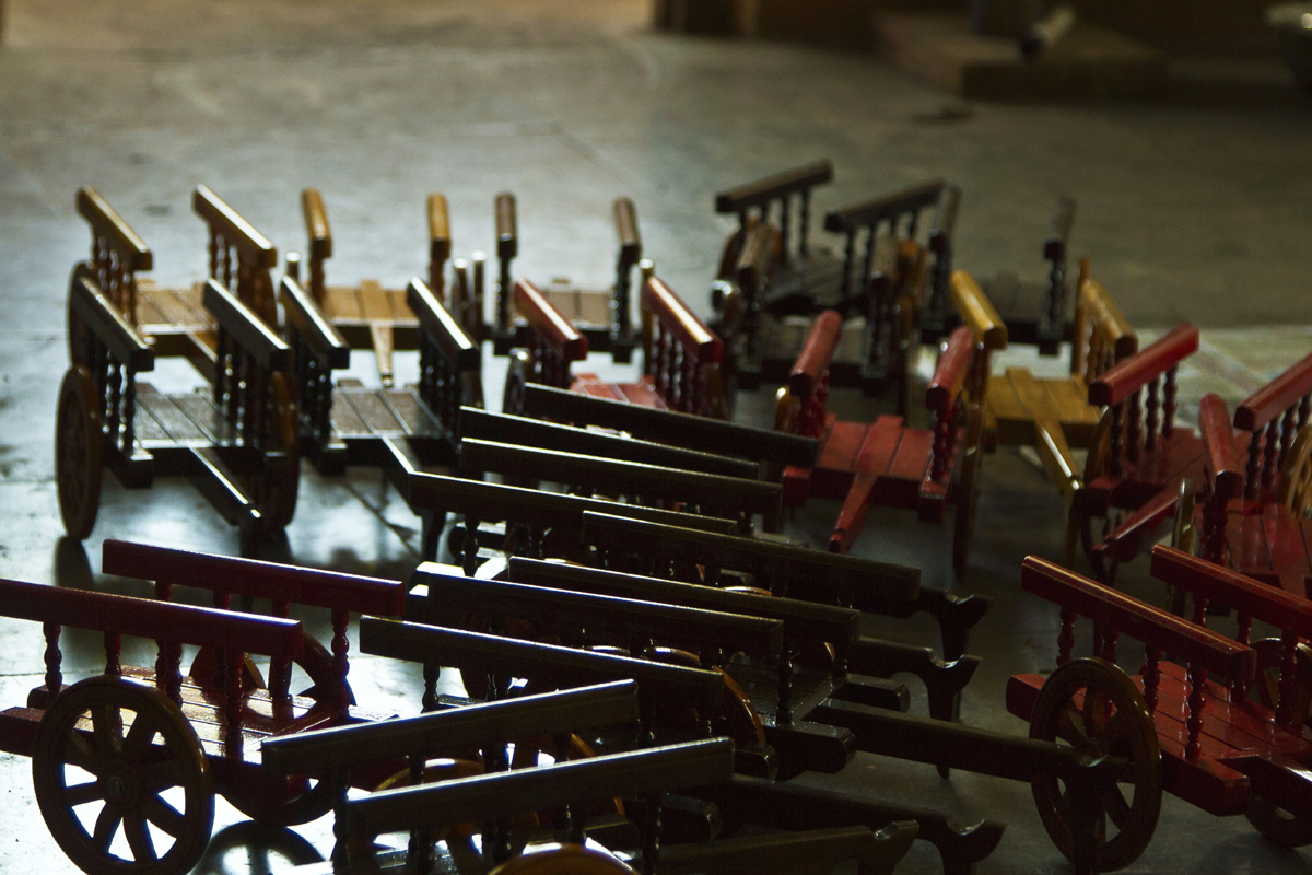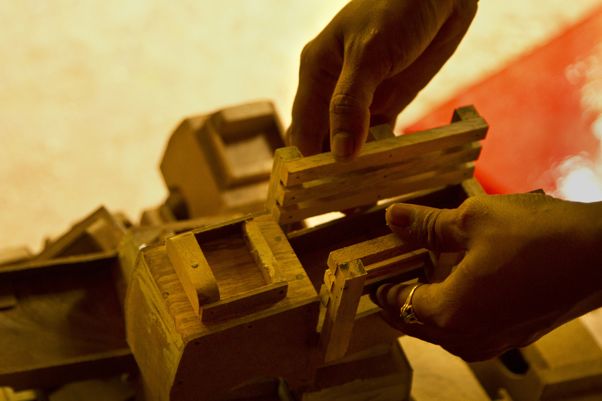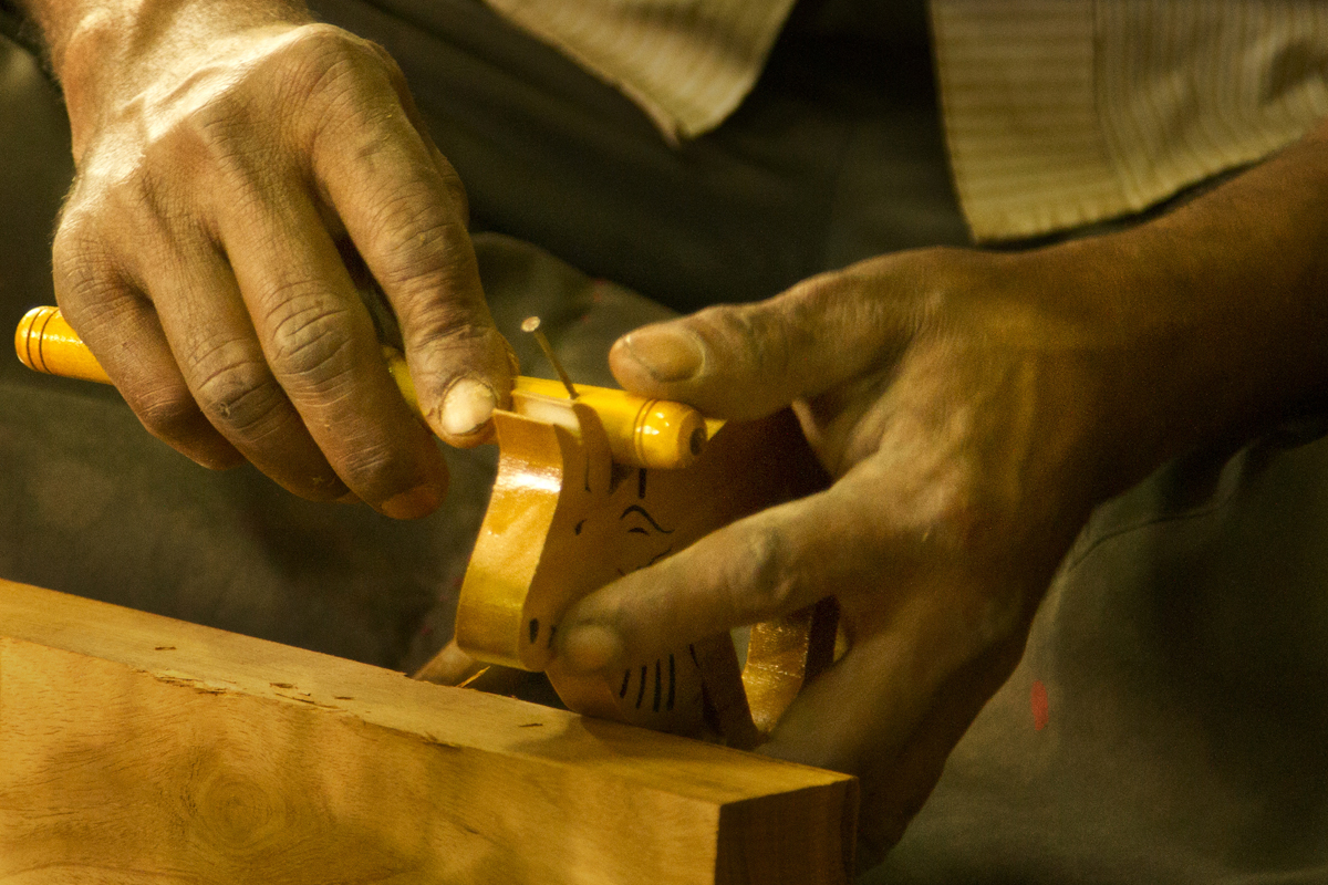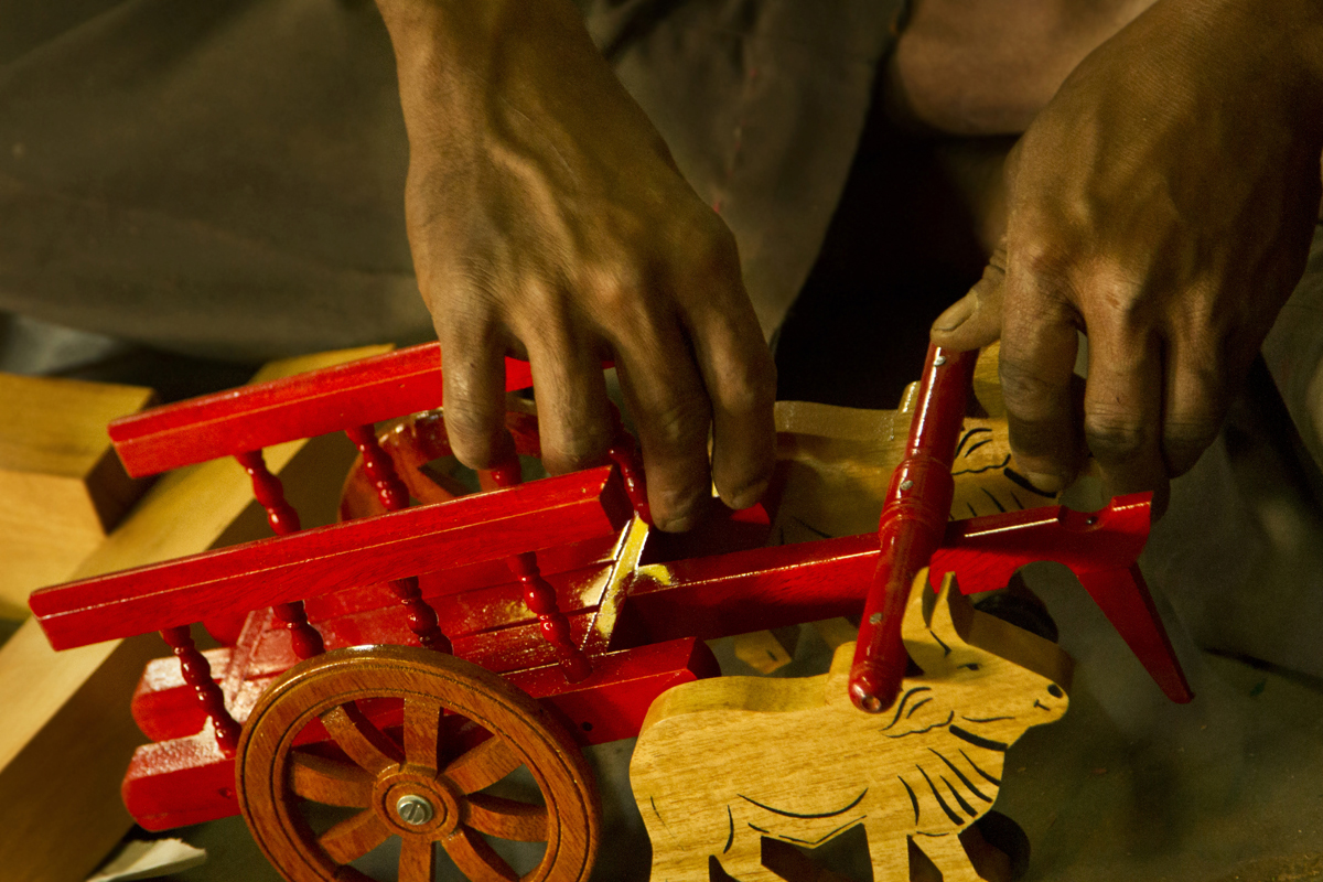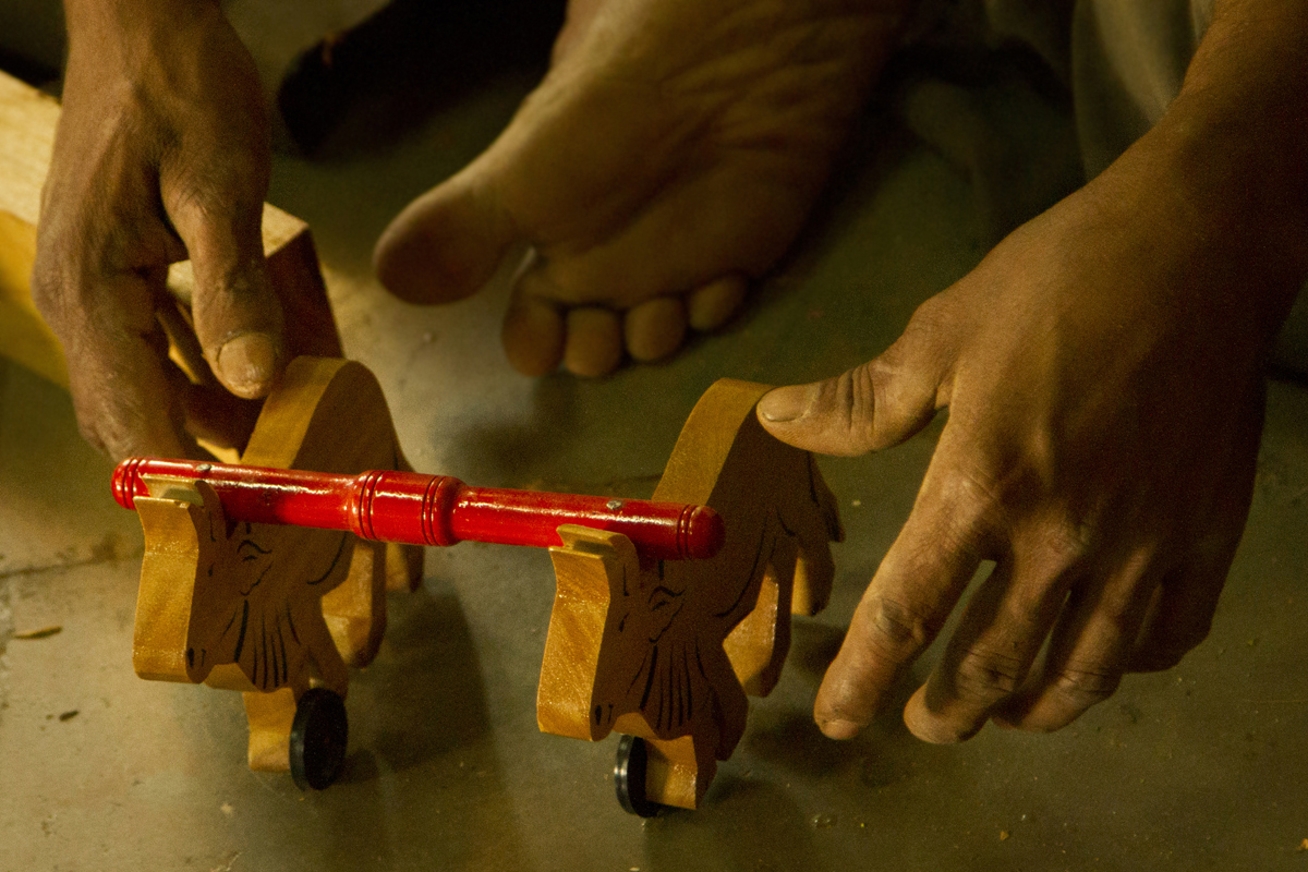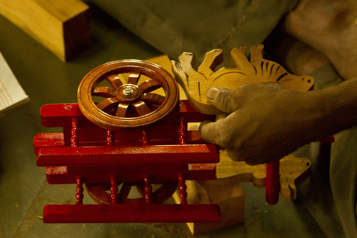 Assembling- The painted articles are assembled together in one piece of toy. The different parts of the toys are joined and assembled together. The parts are nailed with each other with the help of small iron nails. Fixing of toys is done manually. This process is done by experienced craftsmen as they have to assemble the pieces and the mechanical parts of the toy. Some toys are fixed with plastic wheels and other such accessories to the toys. It takes at least two to three days to finish a medium sized toy and fifteen to twenty days to complete 100 pieces of such toys. All the steps are done manually except sanding and drilling.