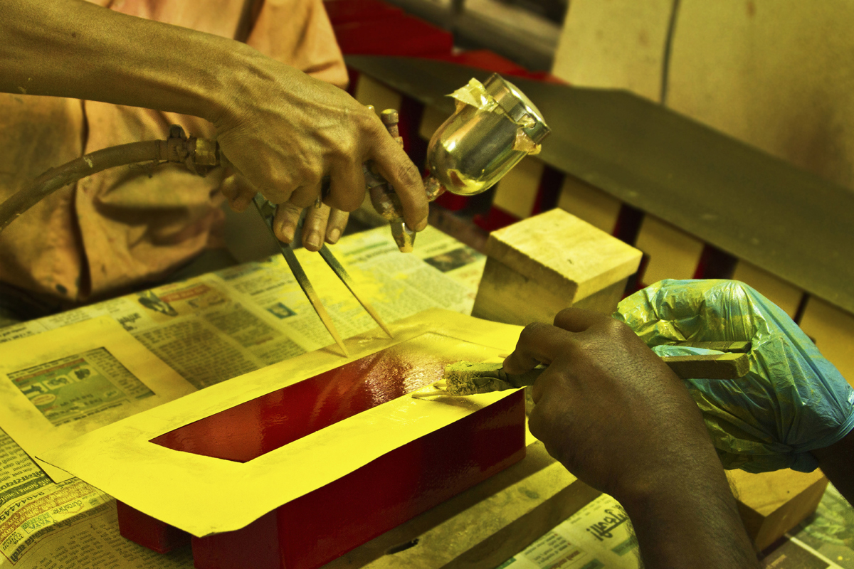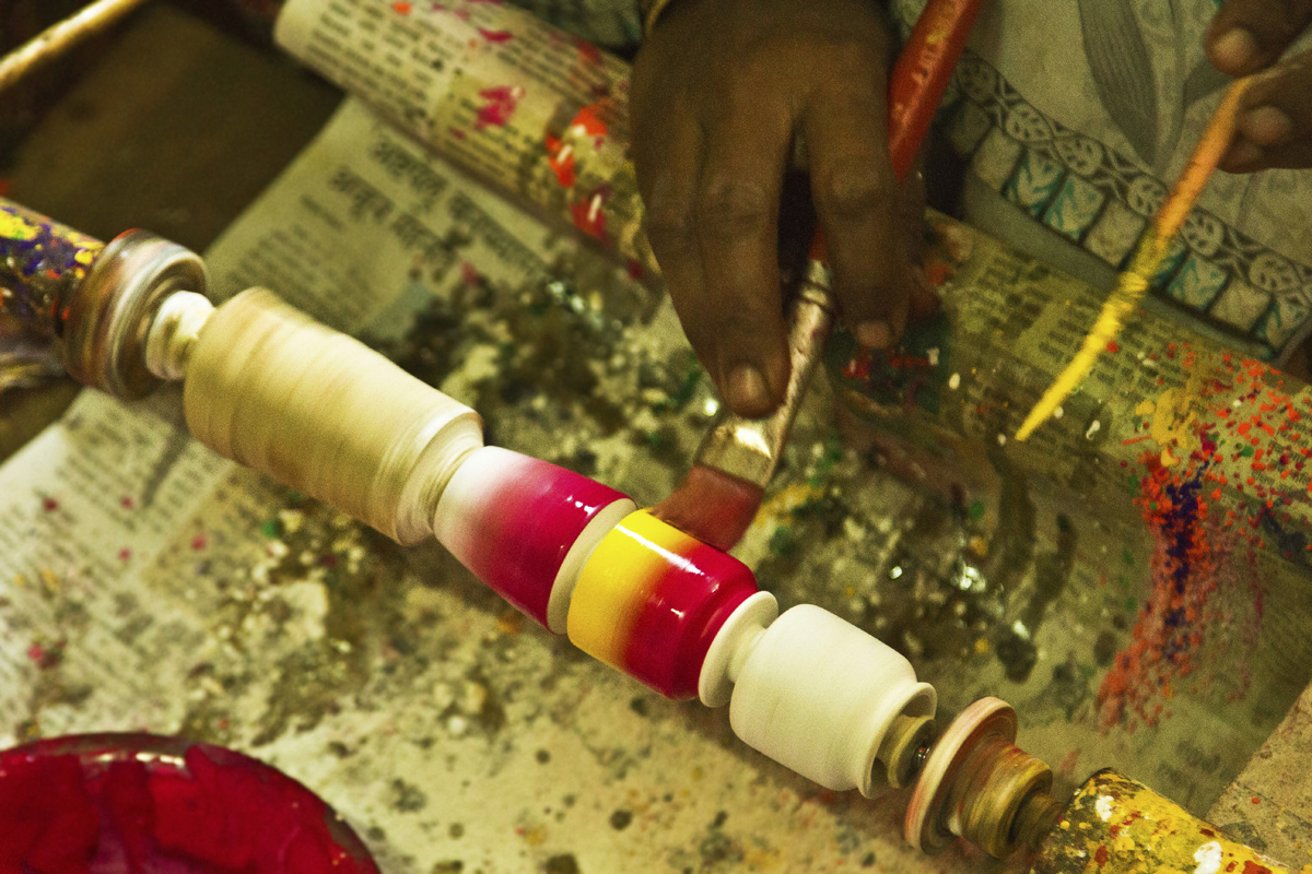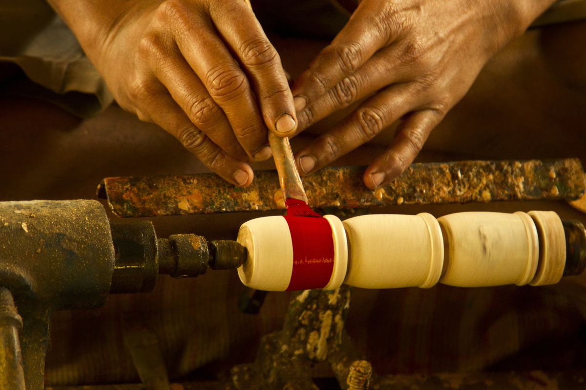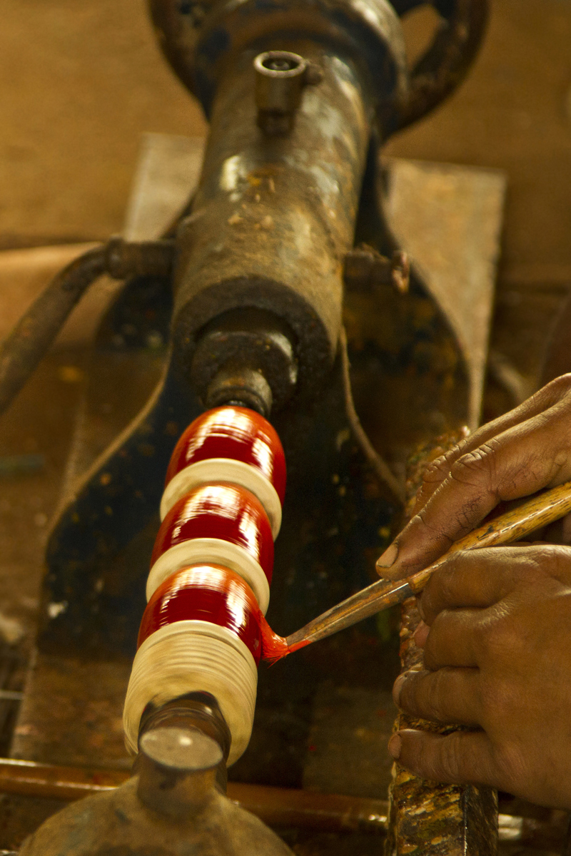 Different shades of colour powder are well mixed with wood primer and kept to settle for a while. Pieces of toys are fixed to the turning machine and painted with desired colour and kept to dry. Two colors are merged together and brushed with dry paint brush to get a smudge texture. Some toys are spray painted to save the time. All the toys painted with three coats of paints for long durability. When the paint is dried craftsmen paint the details like facial expression and outlines. Finally a coat of wood primer is applied on them to the wood from observing moisture and gives shine and luster to the final products. Women artisans are also involved in this work.