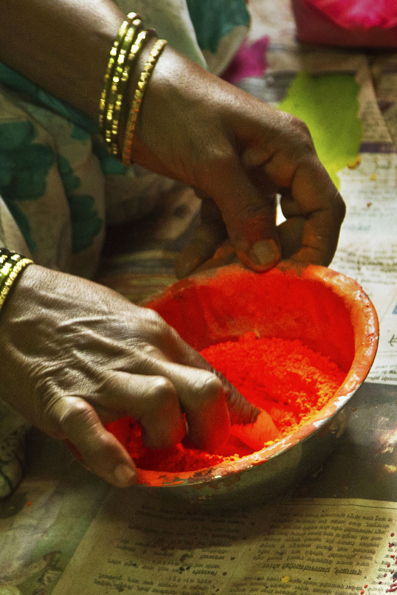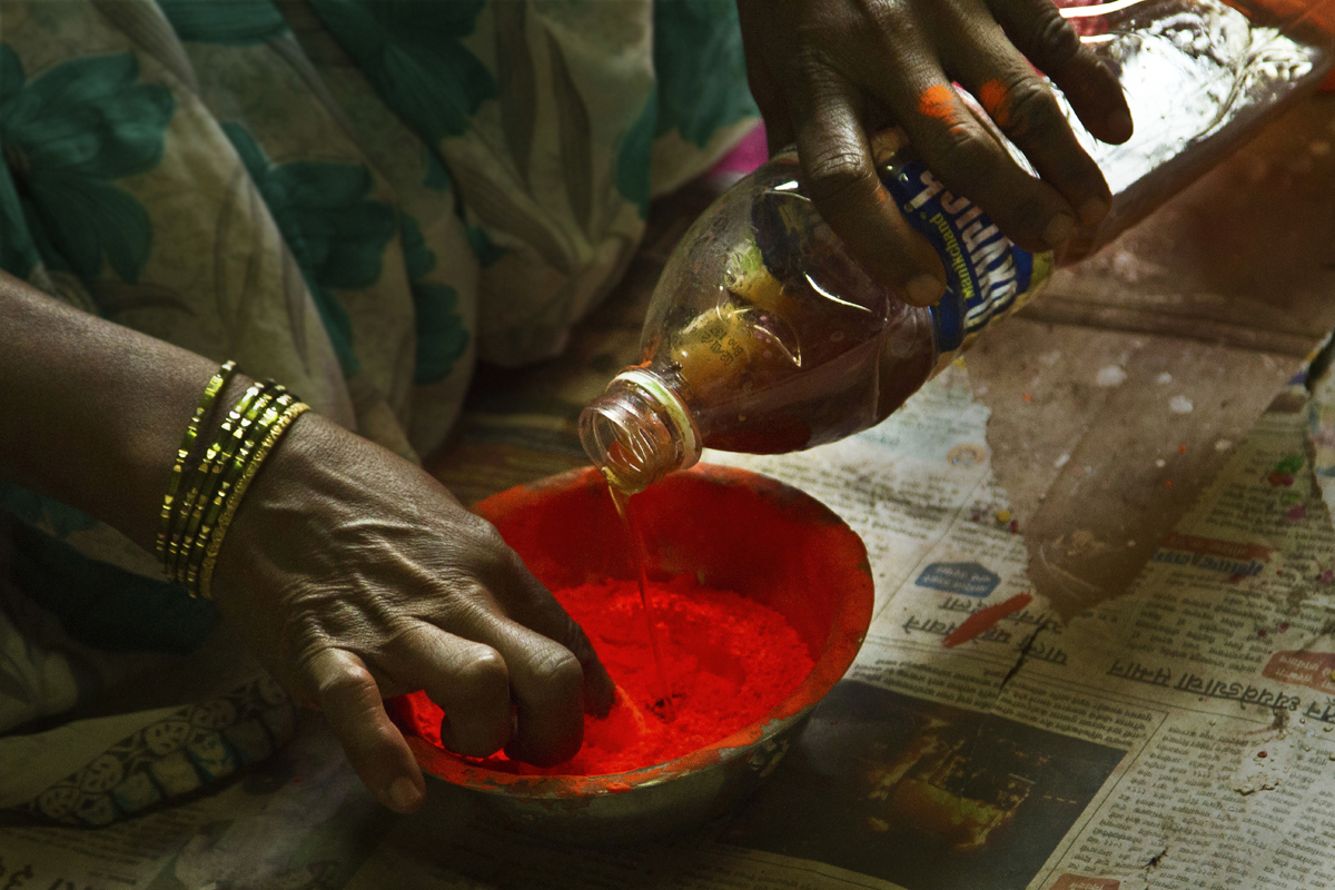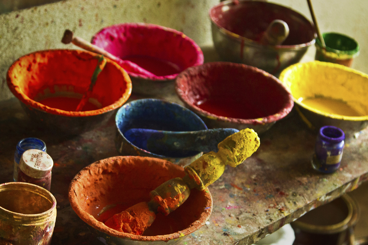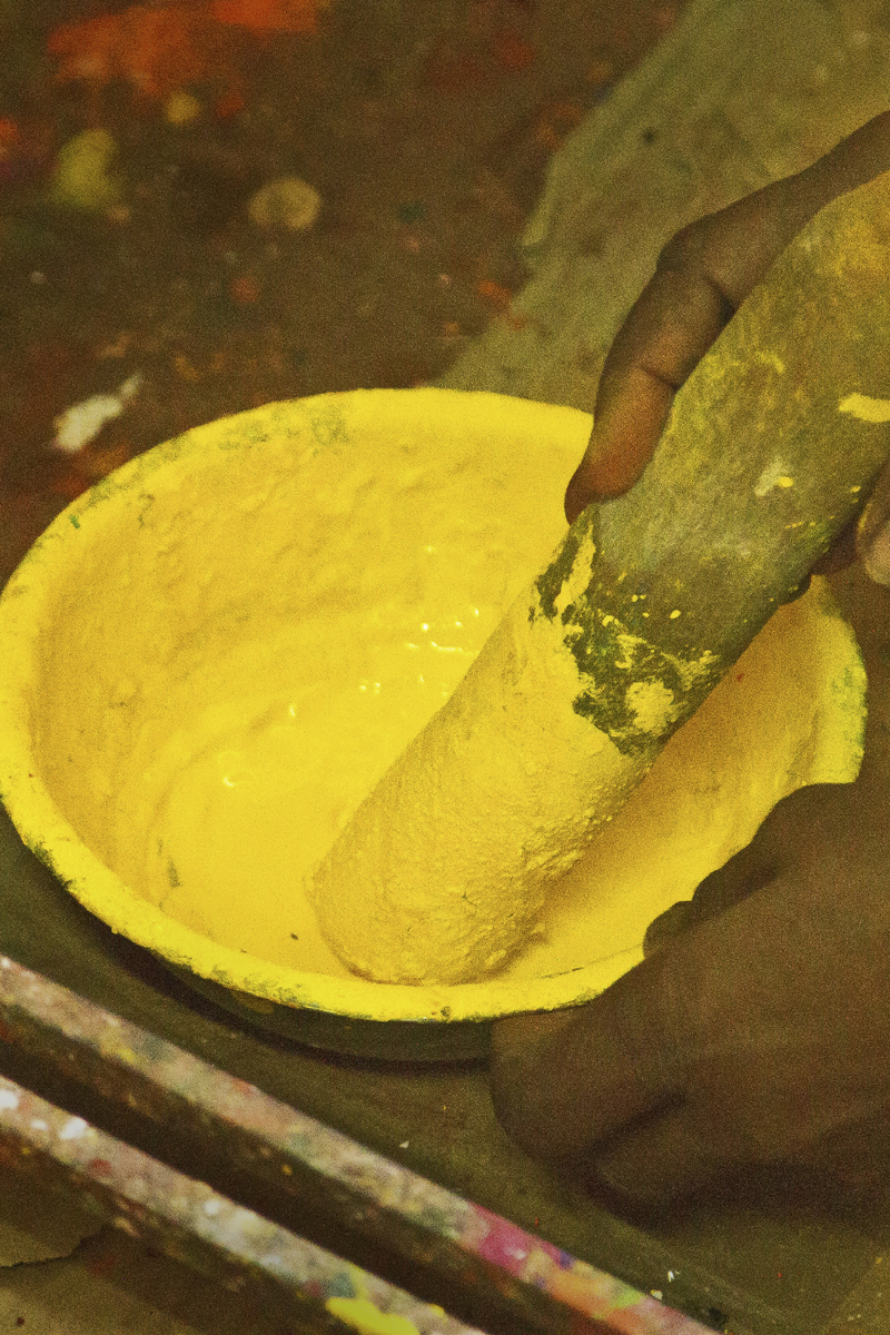 Different shades of colour powder are well mixed with wood primer and kept to settle for a while. Pieces of toys are fixed to the turning machine and painted with desired colour and kept to dry. Two colors are merged together and brushed with dry paint brush to get a smudge texture. Some toys are spray painted to save the time. All the toys painted with three coats of paints for long durability. When the paint is dried craftsmen paint the details like facial expression and outlines. Finally a coat of wood primer is applied on them to the wood from observing moisture and gives shine and luster to the final products. Women artisans are also involved in this work.