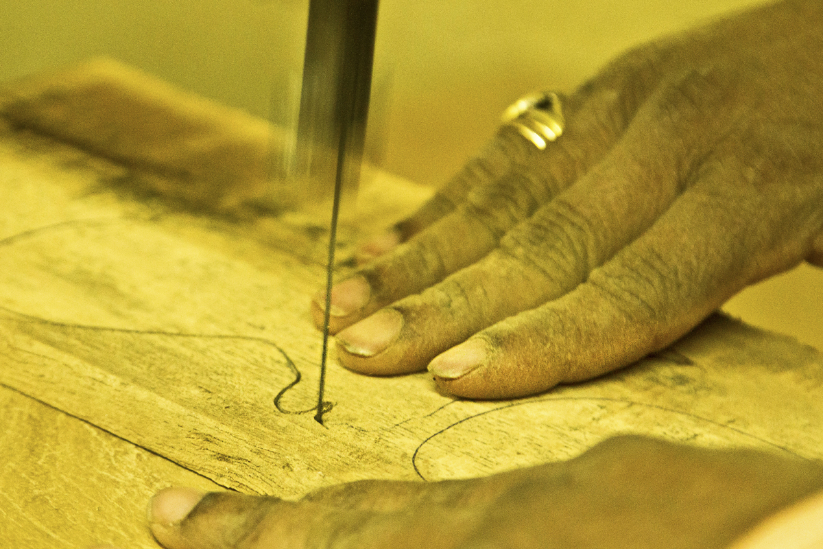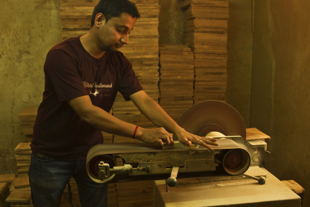 The sample piece is kept on the wooden plank and outline marking is made around on the plank. The design is drawn close to each other covering the whole surface to prevent from wastage of wood. The marked plank is taken for cutting process. The pieces are cut according to the design with the help of a thin saw blade. The parts of the toys are cut separately and then joined. At a time more than hundred pieces are cut. Craftsmen also use plywood sometimes. All the cut pieces are further taken for sanding process. The cut pieces sanded by a turning machine attached with a sand belt. This process is done to smooth the rough edges of the cut piece and give a proper shape to the toy piece. Some piece of the toy is chiseled of the wood by fixing the wood piece to the turning machine. This process doesn’t contain any marking of the design. Craftsmen directly chisel the wood into desired shape and smooth the rough edges with the help of a sand paper.