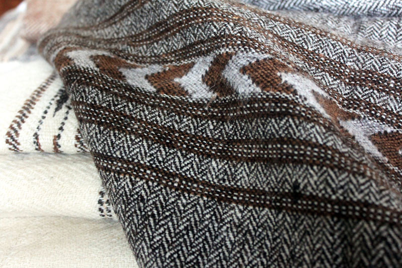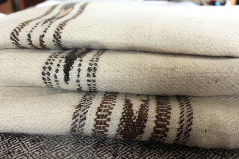 The motif designs are composed of vibrant colour combinations. Few grey design patterns are obtained by blending natural shades (light and dark) of undyed wool.