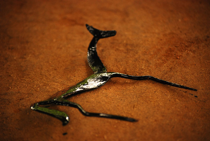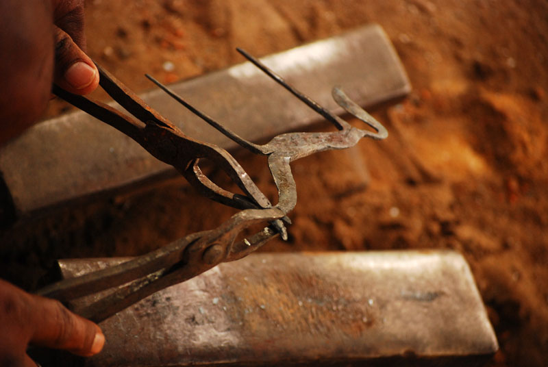 The raw material used for the craft is predominantly recycled iron scrap, taken from household or market. The main tools used are Dhukna Sar (furnace), Muthli (hammer), Chimtas (forceps), Sandasis (tongs) and Chenni (chisels). These tools are made locally by the lohars themselves. The process starts with scrap iron being beaten repeatedly when hot. It requires no casting and molding. Desired shape is given carefully by beating it at necessary spots. Then unnecessary portions are cut away and filed to remove sharp objects. On completion, varnish coat is applied to enhance the luster. Both hollow and solid figures are made. For making a hollow figure, iron sheets are folded, cut and filed as per the need of the form. In a solid figure the main body parts are made first and then the detailing is done with the help of small chisels.